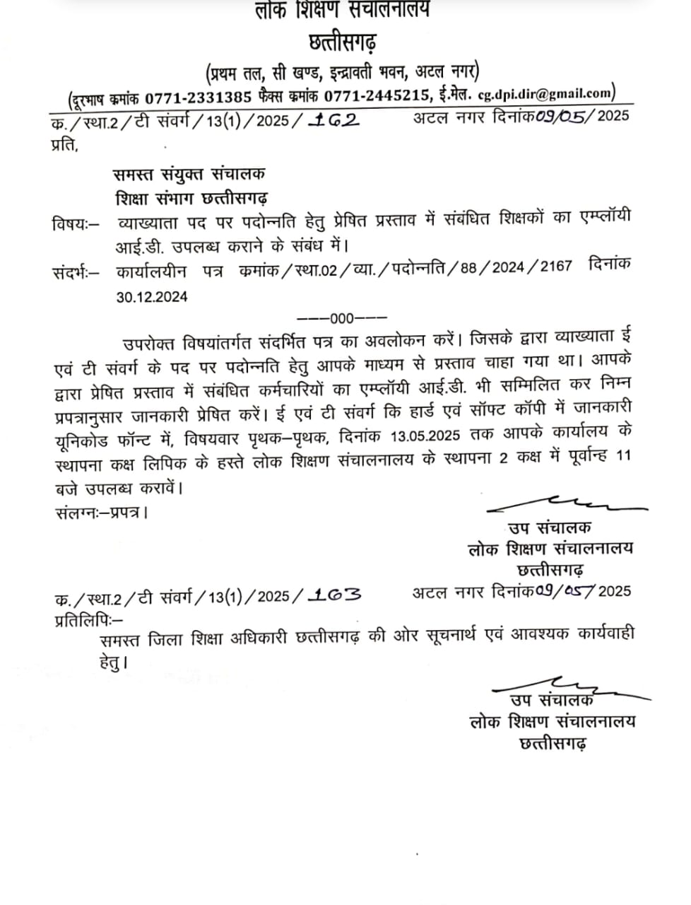 रायपुर – व्याख्याता प्रमोशन की प्रक्रिया चल रही है। प्रमोशन प्रक्रिया के बीच डीपीआई ने सभी जेडी को पत्र भेजकर व्याख्याता पद पर पदोन्नति हेतु प्रेषित प्रस्ताव में संबंधित शिक्षकों का एम्प्लॉयी आई.डी. उपलब्ध कराने को कहा है।